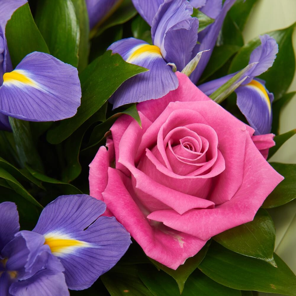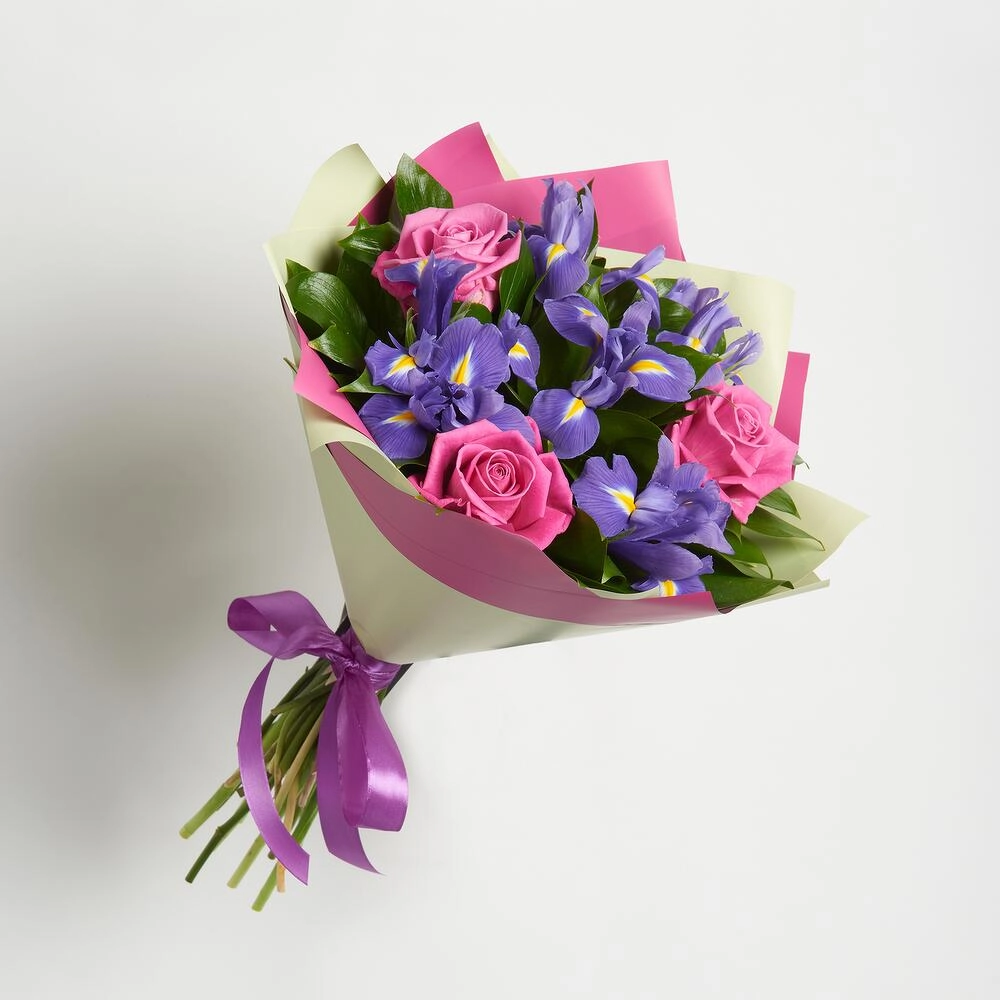 Изысканный букет из синих ирисов и розовых роз – гармония контрастов